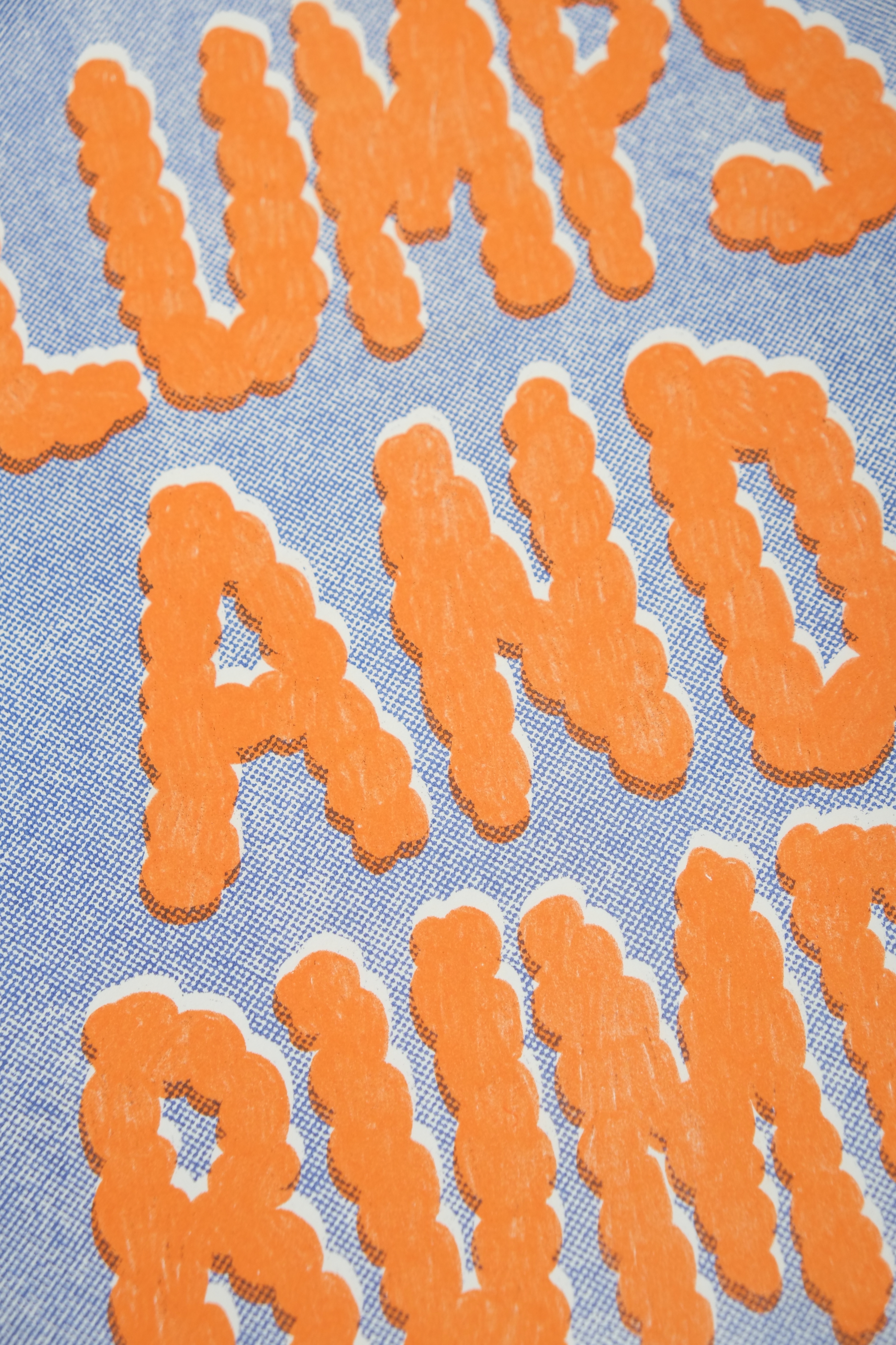 Risographed on 250gr biotop paper in vibrant orange and navy blue.