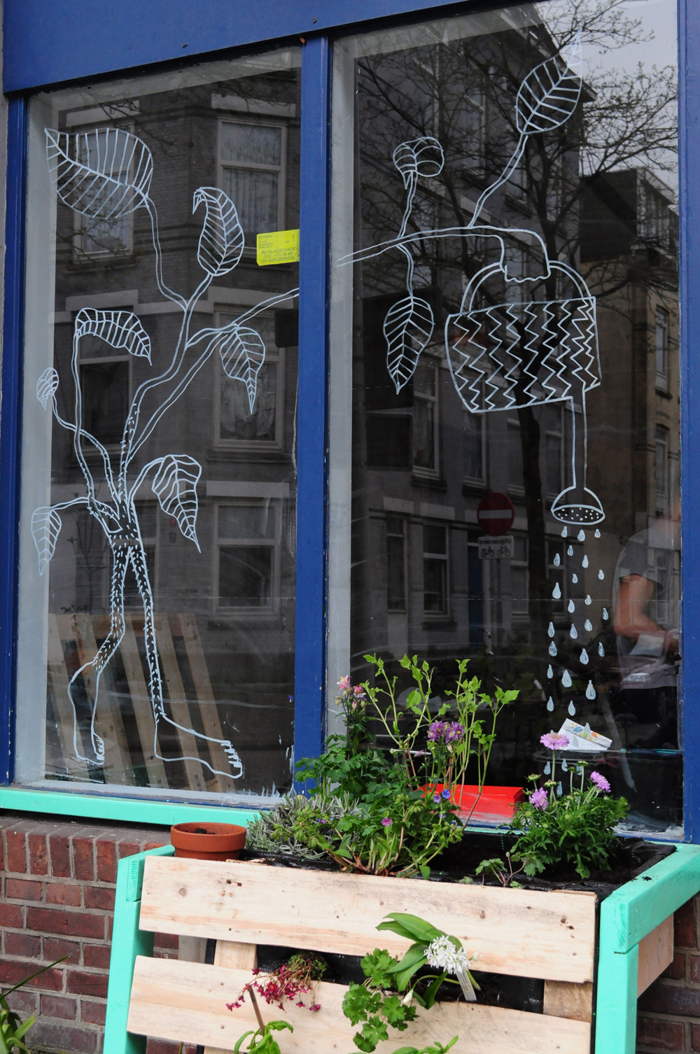had this initiative to bring more green to a neighborhood in Rotterdam. They designed and built these benches that will have plants integrated in them. I was asked to make some illustrations on the glass windows.